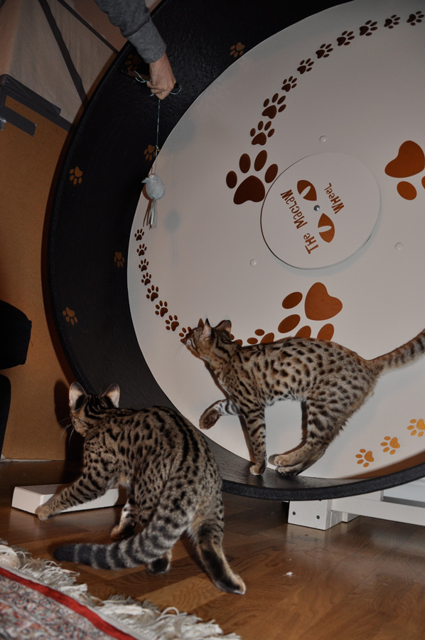 Just a few words to thank you for the wheel, all three of our Bengals love it and it never seems to stop, as 1 gets off another jumps on. It's a great source of exercise and constant fun watching them, they actually call (meow) for attention so they are being watched while using it.
