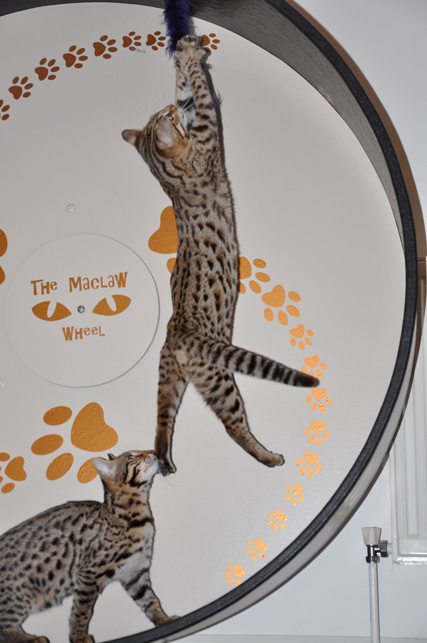 We have two very energetic EG Bengal brothers and as such are keen to channel their energies and keep them fit and healthy. I had heard of cat wheels before and decided to research them with the intention of purchasing one. After trawling the net it was clear that the Maclaw wheel was consistently recommended by happy owners. I placed an order and Jacqui helped us through the process and kept us advised on the wheels progress.